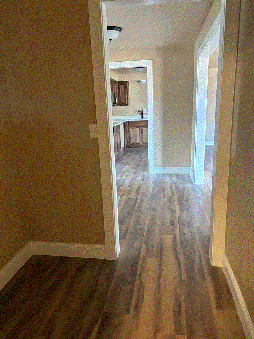 The home has an attached double car garage. Washer and dryer hook ups are in the garage. The home is covered in brand-new paint and plank flooring throughout. There is a private side patio out the sliding glass door leads out to an extra-large back and side yard.